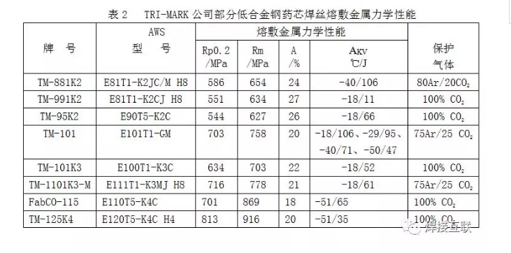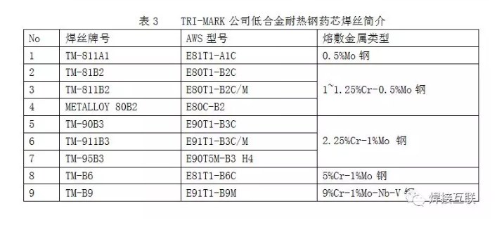 1.产品系列化方面:TRI-MARK可提供的低合金钢药芯焊丝品种多达35种(包括低合金高强钢药芯焊丝17种、耐热钢药芯焊丝9种、低温钢药芯焊丝8种及耐候钢药芯焊丝1种),熔敷金属强度等级从500MPa到820MPa的焊丝产品,都可批量供应。TRI-MARK公司部分低合金钢药芯焊丝融敷金属化学成分及熔敷金属力学性能分别列于表1、表2;耐热钢药芯焊丝的牌号及型号见表3;LINCOLN公司耐热钢药芯焊丝性能简介见表4。这些药芯焊丝可满足工业生产领域各方面的需要,有力地推动了机械化、自动化焊接水平的提高,促进了工业制造水平和劳动生产率的提高。