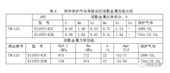 2.保护气体类型方面:在TRI-MARK公司的65种药芯焊丝中,使用100%CO2气作保护的有24种,使用Ar+ CO2混合气的有22种,既可使用100%CO2、也可使用Ar+ CO2等混合气的有8种,自保护的有4种。在金属粉芯焊丝使用的Ar+ CO2混合气中,有98Ar/2CO2,还有75Ar/25 CO2配比。TM-115焊丝在两种保护气体情况下,焊接所得的熔敷金属性能如表4所示。保护气体类型的选用,一方面要服从于焊缝性能的需要,另一方面也取决于对焊接工艺性能、焊接效率等因素的要求。