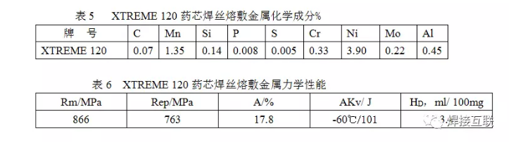 3.药芯焊丝的渣系方面:在TRI-MARK的碳钢及低合金钢药芯焊丝中,碱性渣系品种比例不到10%。国外药芯焊丝生产企业,除液空集团的奥利康焊材(Oerlikon)等少数公司,以生产碱性渣系、表面镀铜的无缝药芯焊丝作为其特色产品外,其它如神钢、伊萨、及林肯等国外著名企业,碱性焊丝的品种近期内都在减少,在碳钢、低合金钢药芯焊丝中仅保留1~2种,最近,合伯特(HOBART)公司推出了一种具有高碱性渣系的低合金高强钢药芯焊丝FabCO XTREME 120(AWS E121TG-GC H4),采用100%CO2保护气体。这种高碱性渣与普通市售碱性药芯焊丝不同,它在各种位置的操作与钛型渣(T1)很相似,具有良好的脱渣性和低的飞溅量。更为突出的是在宽的热输入及冷却速度范围内,熔敷金属有着高强度与高韧性的完美匹配。表5、表6分别列出了XTREME 120药芯焊丝、熔敷金属化学成分及力学性能。