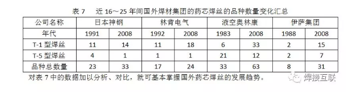 神钢、林肯、液化空气集团和伊萨集团在近16~25年间,结构钢用气保护药芯焊丝中T-1型、T-5型产品数量的变化汇总于表7。