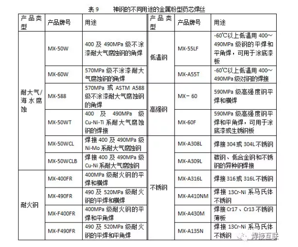 如果钢板上涂有防锈漆,在电弧热的作用下,钢板上的底漆分解成H2、CO和金属蒸气,容易产生气孔。神钢已经开发了用于涂漆钢板焊接的金属粉型药芯焊丝,通过以下三个途径促进熔池中气体的浮起和逸出,防止在焊缝中形成气孔。(a)降低焊缝金属的扩散氢含量;(b)适当降低熔渣的熔点和粘度,有利于熔池中气体的逸出;(c)减少造渣剂含量,随着造渣剂的减少,焊缝表面渣量减少,渣壳减薄,有利于气体逸出。这种焊丝已广泛应用于造船、桥梁等行业。神钢的金属粉型药芯焊丝品种齐全,划分非常细緻,其中又以490MPa级焊丝品种最多,且各具特色。在神钢的焊丝产品中,有15个490MPa强度等级的牌号,每种牌号对应的特征和使用条件各不相同,既有专门用于薄板、中板、厚板或涂漆板的焊丝,也有耐超声波探伤性能的焊丝,方便用户根据实际需要来选择最适合施工要求的产品。神钢生产的490MPa级金属粉型药芯焊丝汇总于表8。神钢除了490MPa级金属粉型药芯焊丝外,另有5类不同用途的金属粉型药芯焊丝,即耐大气/海水腐蚀钢、耐火钢、590~780高强度钢、低温钢和不锈钢用的金属粉芯焊丝,这些焊接材料的特征简介于表9。