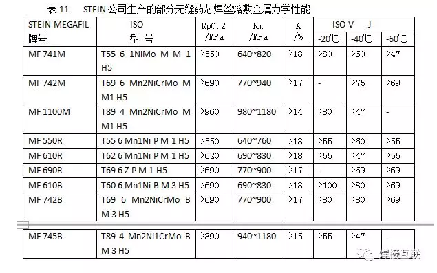 STEIN公司可提供适合不同高强钢焊接所需的无缝药芯焊丝,这些药芯焊丝包括金属粉芯焊丝、金红石型或碱性药芯焊丝。金红石药芯焊丝主要用于屈服强度690MPa以下的结构钢焊接;对于更高屈服强度甚至达到1100MPa的钢材,主要选用金属粉芯焊丝;碱性焊丝主要用于韧性特别高的材料。无缝药芯焊丝已用于母材屈服强度690MPa、厚度达177mm的海上采油平台的桩腿焊接,也可用于X42~X120长输油、气管线钢的焊接。STEIN公司生产的部分无缝药芯焊丝性能分别列于表10、表11。