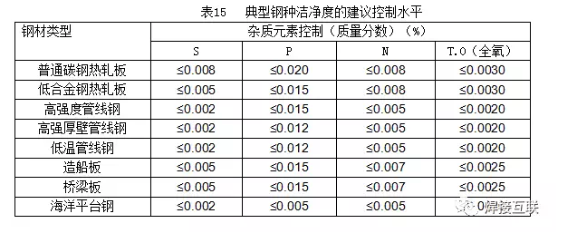 国外的一些公司还开发出了碳钢、细晶粒钢及不锈钢用的“快凝渣”型药芯焊丝,这种金红石酸性渣系无缝镀铜药芯焊丝,改进了填充率,使其具有更高的熔敷率,进一步提高了焊接速度。全位置焊时,可以只用一套焊接参数,配合适当的焊接装置,实现全自动焊接。高纯净度焊丝 随着冶金工业的技术进步, 目前各类重要的焊接结构用钢正向洁净化(低S、P、O、N、H)、低碳超低碳化、微合金化、超细晶粒化方向发展,各强度级别钢材的韧性都得到了显著提升。有专家指出,产品的纯净度是保障钢铁性能的基本要素,并对典型钢种的洁净度水平提出了建议,见表15。