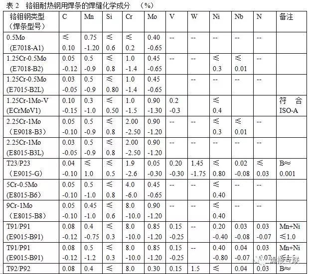 1.焊条:该公司的铬钼耐热钢用焊条,大部分都采用高纯度的低碳钢焊芯,通过药皮过度合金元素,以满足焊缝成分和性能的要求。药皮渣系都采用碱性,以获得高的焊缝韧性。在药皮中再加入适量铁粉,使其熔敷效率达到105~130%,故属于铁粉焊条;这种铁粉焊条,工艺性能良好,适于全位置焊接,又具有较高的效率。焊缝化学成分及力学性能,可通过调整药皮中的合金加入量来实现。但是,也有少量产品采用合金焊芯,即通过焊芯来过渡合金元素,这样可进一步提高焊缝金属的纯净度,以便获得更高的焊缝韧性及耐腐蚀性能等。