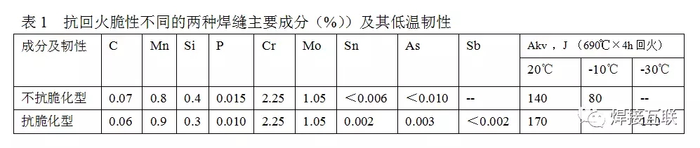 Cr-Mo耐热钢在长期的高温下工作,会发生回火脆化及韧性降低等问题,一般在375℃~575℃温度范围内出现。而石油精炼时,反应塔的操作温度通常在400~800℃,正处于这个脆化温度区。为了确保运行安全,提高抗回火脆化能力,在低温韧性方面,对耐热钢及其焊接材料均提出了更高的要求。在实验室里,常采用脆化促进热处理试验(Step Cooing Test),即步冷试验或阶梯冷却试验,以再现操过程中的回火脆性。研究资料表明,钢及焊缝金属中的杂质(P、Sn、Sb、As等)对回火脆性有很大影响。通过试验,得出了下列关系式: