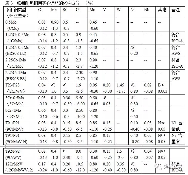 从铬钼耐热钢的焊丝成分上看,同一种耐热钢所要求的焊缝成分应当是相同的,且与母材成母相接近,故进行TIG、MIG及埋弧焊接时,可采用同一成分的实心焊丝,在EN标准中也注明同一种焊丝可用于这三种焊接方法。MIG焊接时,如果保护气体的氧化性小,那末对焊缝成分和性能不会造成影响;但是,随着保护气体氧化性的增强,Si、Mn等元素有所烧损,焊缝强度和韧性都会有所下降。埋弧焊接时,可以从烧结焊剂中过渡少量合金元素,获得需要的焊缝成分和性能。各种铬钼耐热钢用实心焊丝的化学成分汇总于表3。
