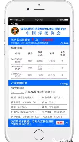 工信部《工业互联网平台建设及推广指南》的发布,为中国焊接协会前瞻性制定团体标准《焊接材料可追溯信息化标识》、《焊接术语-焊接材料》、《焊接术语-焊接基础》、《焊接术语-熔化焊》、《焊接术语-焊接检验》打下坚实的政策上实施推广依据,为协会制定统一的焊接行业工业互联网数据编码和信息结构标准打下了坚实基础;为服务于焊接工业互联网技术创新做了信息传输基础准备。与《焊接材料可追溯信息化标识》标准配套搭建中的焊材识别系统见图2,可以满足我国当前焊接产品信息的网络化、数字化、可追溯化的发展需求,可以为焊接材料用户企业提供一个权威的产品身份真实性证明,解决产品在营销和质量追溯存在的真伪难以识别的问题。该系统的《焊接产品质量认证书》见图3。一经平台审核生效后,该证书即具有质保书同等效力,其中的关键信息,如产品名称、型号、批号、生产日期和化学成分、力学性能等信息有对应的“证书编号”的唯一性,不可更改;目前,中国焊接协会联合国家焊材质检中心面向相关使用和生产企业大力推进焊接材料产品可追溯的信息化认证工作。该系统最终将面向全社会、全行业用户企业免费开放,提供免费查询焊接材料真伪、质量证明书等相关服务。