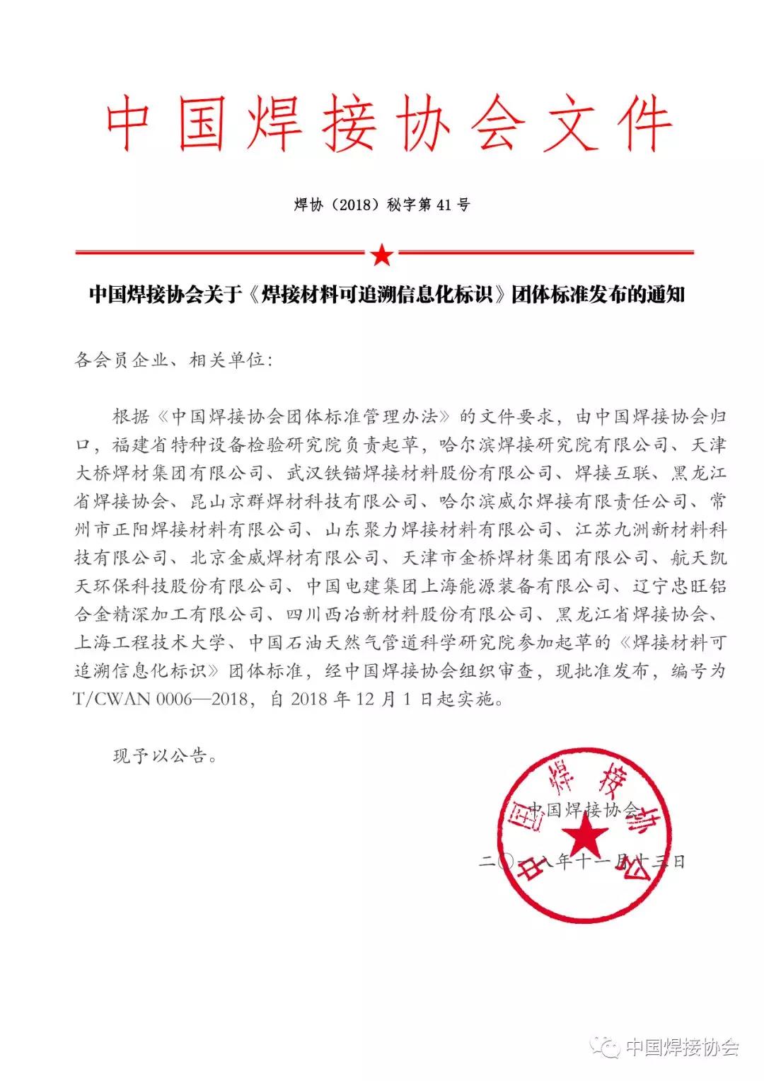 (内含PDF附件)丨中国焊接协会关于《焊接材料可追溯信息化标识》团体标准发布的通知