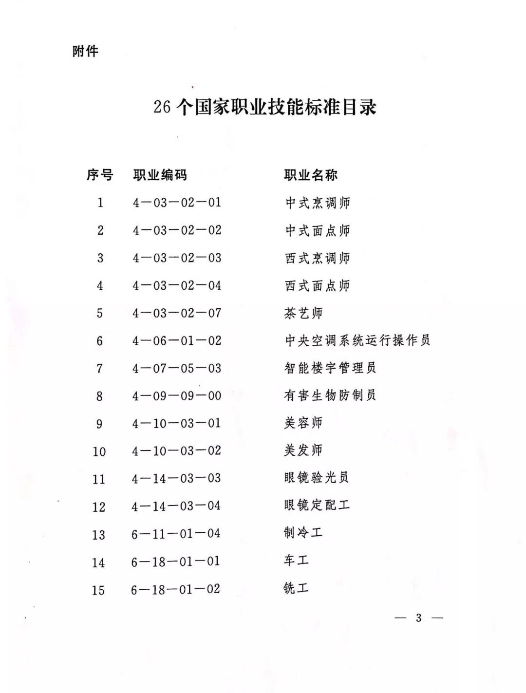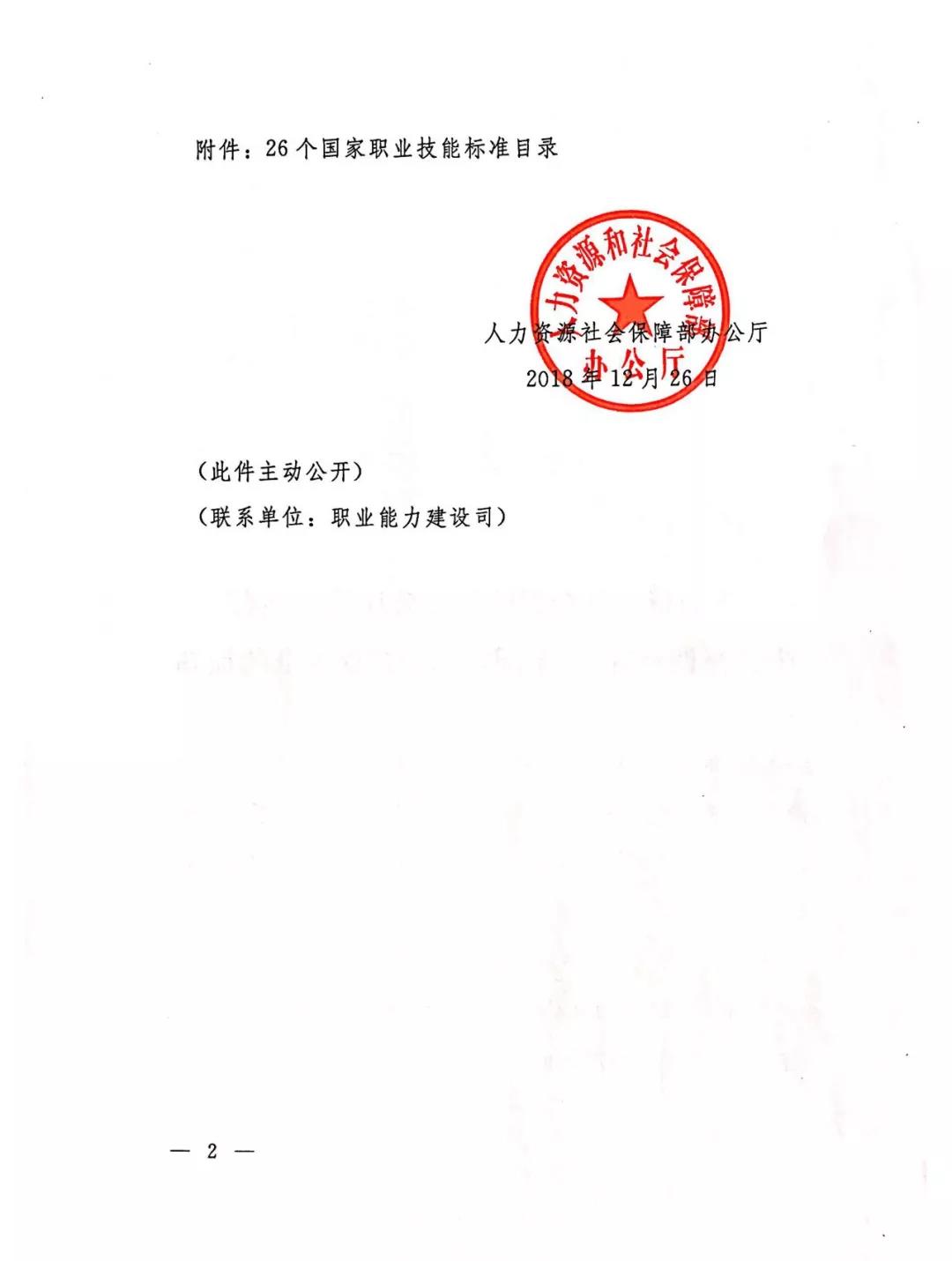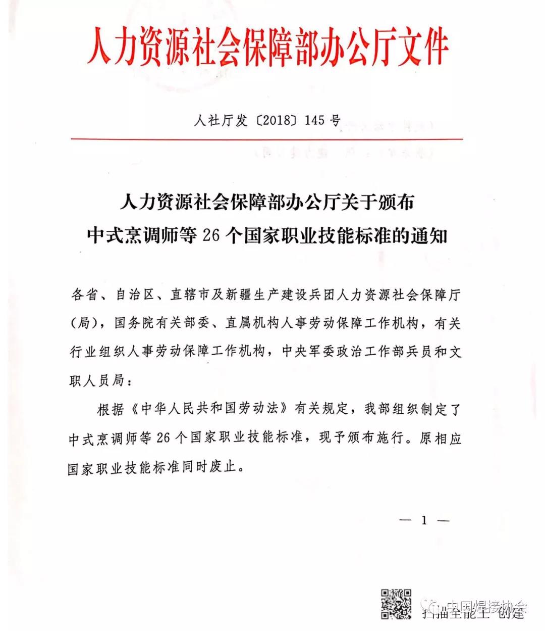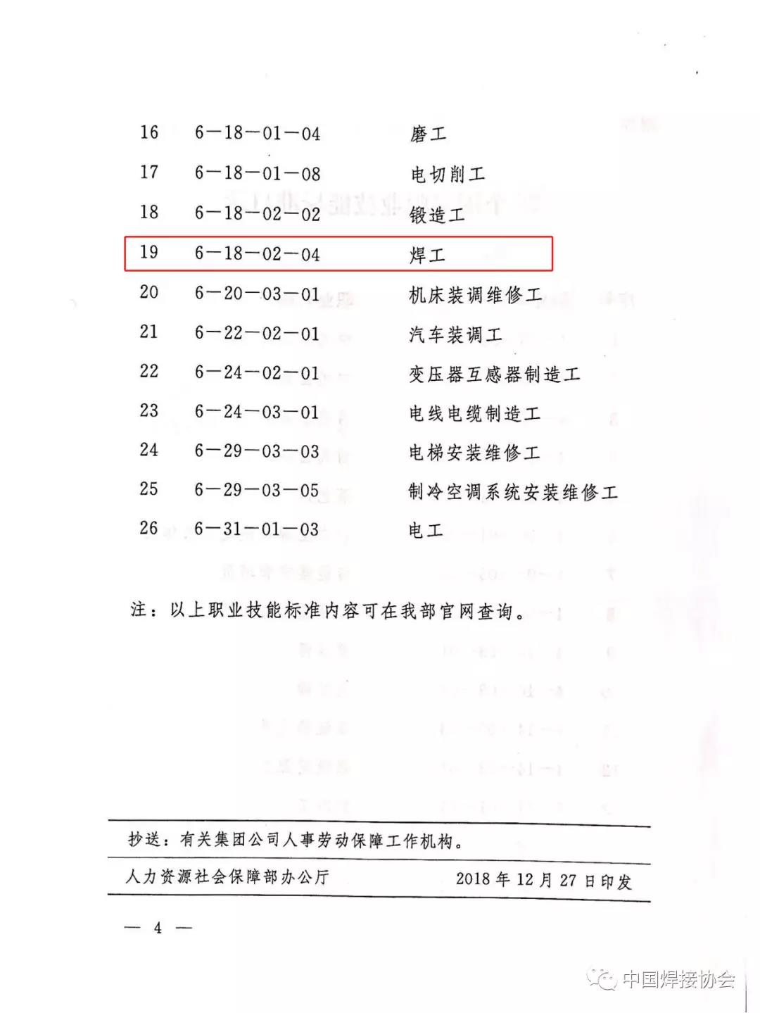 人力资源社会保障部办公厅关于颁布焊工等26个国家职业技能标准的通知